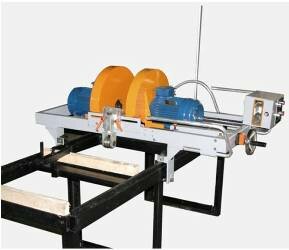 Одна пила устанавливается на неподвижный шпиндель, другая пила подвижная. Расстояние между пилами регулируется специальным винтовым механизмом и контролируется с помощью цифрового датчика линейного перемещения и дублируется линейкой. Перемещение пильной тележки осуществляется по станине немеханизированным способом. Привод пильных дисков от двух электродвигателей. Режущий инструмент - дисковая пила простая или с твердосплавными напайками